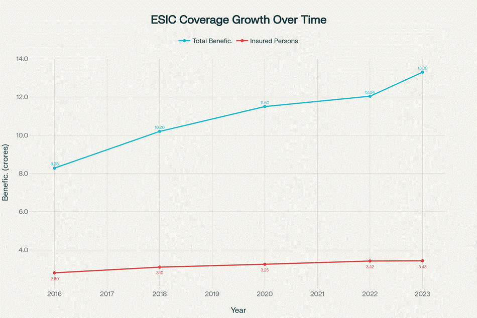 Growth in ESIC Coverage: Total Beneficiaries and Insured Persons (2016-2023)