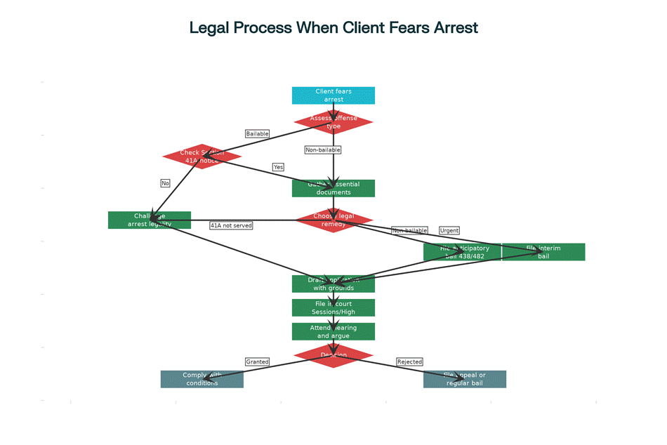 The first step involves comprehensive threat assessment and documentation. Determine whether your client faces imminent arrest (within 24-48 hours) or future apprehension based on ongoing investigation. Document the exact source of threat information: whether from investigating officers, informants, or media reports. This documentation becomes crucial evidence supporting the “reason to believe” standard required under Section 438 CrPC (now Section 482 BNSS).[5][2][6]