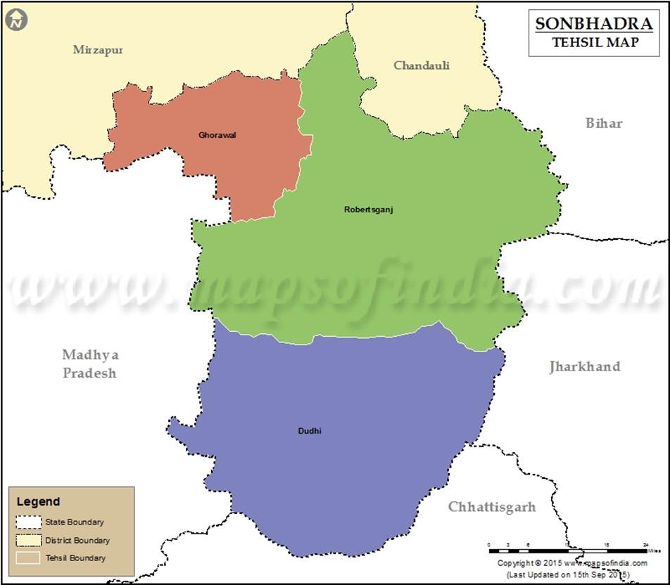 Tehsil map of Sonbhadra district in Uttar Pradesh showing administrative divisions and neighboring districts and states.