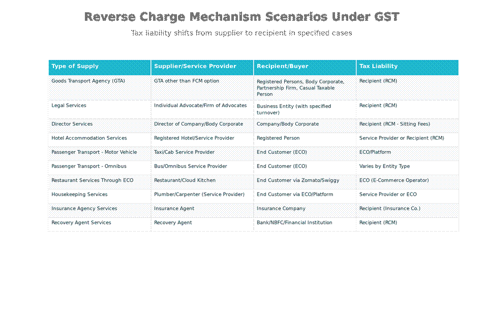 The rationale for RCM lies in targeting informal sectors and ensuring tax compliance from unorganized suppliers who might otherwise evade GST[10][11]. For example, when a business purchases services from an unregistered plumber or carpenter, the RCM mechanism makes the business liable to pay GST on those services, even though the service provider is not registered[3][10]. This shift of liability ensures that GST is collected even from informal supply chains[10].