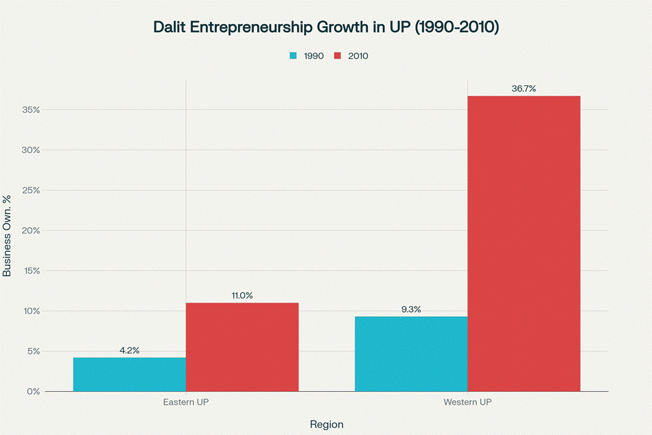 पिछले दो दशकों में उत्तर प्रदेश में दलित उद्यमिता में उल्लेखनीय वृद्धि हुई है, जिसमें पश्चिमी उत्तर प्रदेश ने विशेष रूप से मजबूत प्रगति दिखाई है।