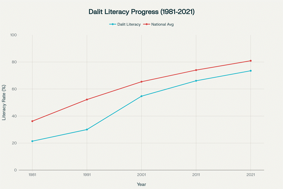 दलित समुदाय के भीतर शिक्षा की परिवर्तनकारी शक्ति को कम करके नहीं आंका जा सकता। सांख्यिकीय साक्ष्य हाल के दशकों में उल्लेखनीय प्रगति को दर्शाते हैं, यह दिखाते हैं कि शैक्षणिक उपलब्धियां समुदायी मान्यता और सम्मान की हकदार हैं। दलित साक्षरता दर 1981 में 21.4% से नाटकीय रूप से बढ़कर 2021 में 73.5% हो गई है, हालांकि अभी भी राष्ट्रीय औसत 80.9% से पीछे है। यह प्रगति उन लाखों व्यक्तियों का प्रतिनिधित्व करती है जिन्होंने ज्ञान और कौशल तक पहुंच के लिए ऐतिहासिक बाधाओं को तोड़ा है। [12][13]