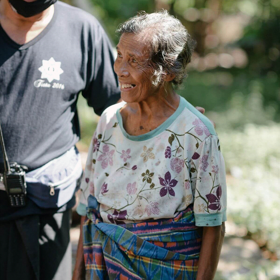 बुजुर्ग व्यक्ति को समुदाय में सम्मानपूर्ण समर्थन प्राप्त होता है, जो उम्र और बुद्धिमता के मूल्य का प्रतीक है।