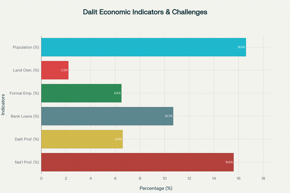Key economic indicators highlighting the challenges faced by Dalit communities in India, showing significant gaps in land ownership, employment access, and financial inclusion despite constituting 16.6% of the population.
