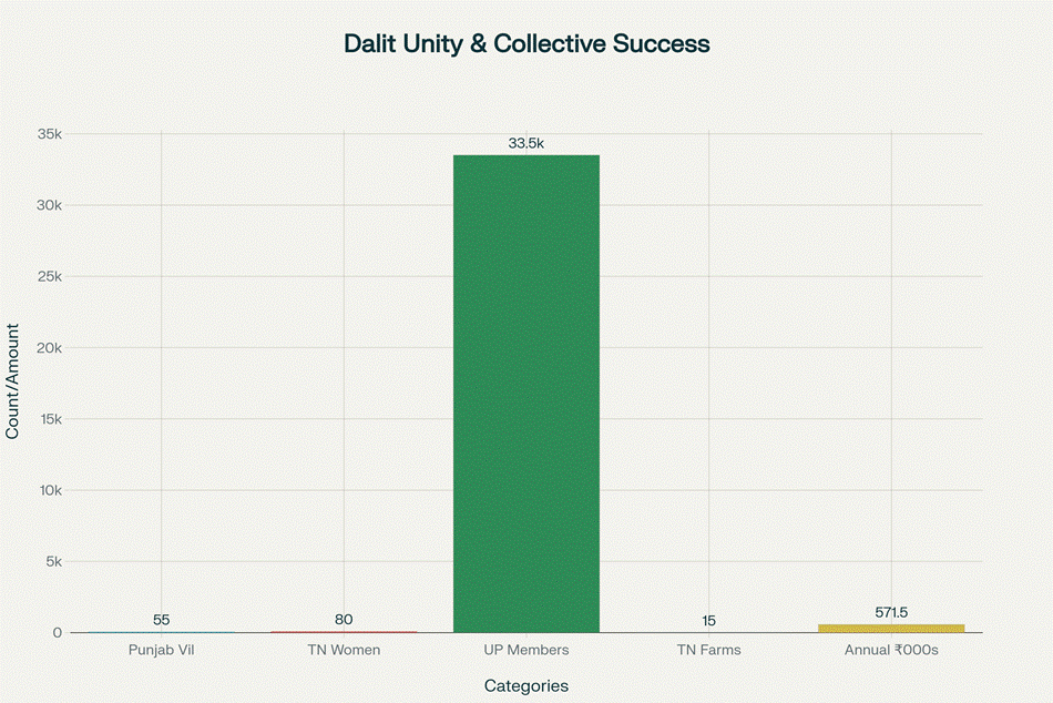 एकता की आर्थिक शक्ति का सबसे ठोस प्रमाण भारत भर की कृषि सहकारी समितियों से मिलता है। पंजाब में, 55 गांवों ने सफलतापूर्वक सामूहिक खेती मॉडल लागू किए हैं जो विशेष रूप से दलित समुदायों को लाभान्वित करते हैं, जमीन प्राप्ति संघर्ष समिति (ZPSC) के माध्यम से आंदोलन को मजबूती मिल रही है। इन सामूहिकताओं ने दलितों की भूमि तक पहुंच और उपयोग के तरीके को बदल दिया है—पारंपरिक रूप से आर्थिक उन्नति की सबसे महत्वपूर्ण बाधा। बलाड कलां गांव में, 133 दलित परिवारों का एक सामूहिक अब 11 सदस्यीय ग्राम समिति के माध्यम से 120 एकड़ आरक्षित सामान्य कृषि भूमि की खेती कर रहा है। आर्थिक प्रभाव पर्याप्त है: इनपुट लागत काटने के बाद, मुनाफा सभी परिवारों के बीच समान रूप से बांटा जाता है, यह सुनिश्चित करते हुए कि सामूहिक खेती के लाभ हर घर तक पहुंचें।[8]